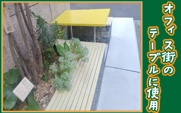 最近の事例では、テーブル、ベンチ、屋外遊具など長い間化粧仕上が求められる場所、
