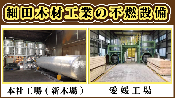細田木材工業の不燃木材の製造は、東京都新木場の工場と愛媛県の愛媛工場の2拠点にて行っております。
