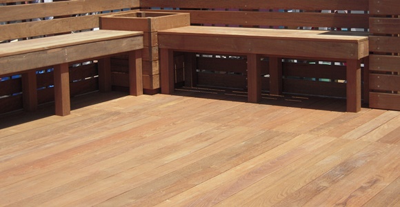 室外機カバー、ベンチ、プランターの据え付け家具もイぺ材で統一して製作しました。